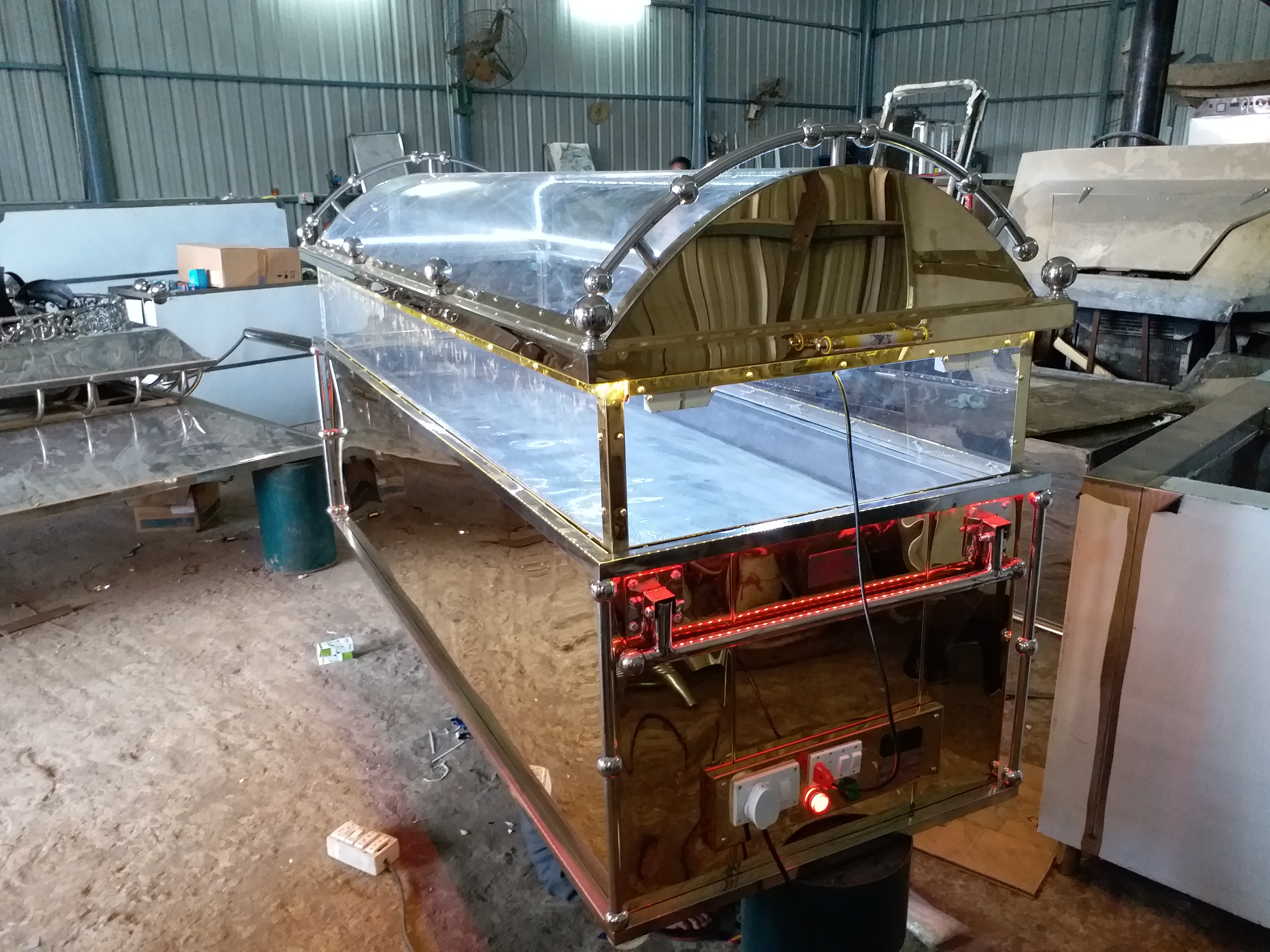 VIP Single Dead Body Freezer Heavy Box Model We are manufacturing the Gold Grand VIP Arch Model in Gold Stainless Steel Single Dead body freezer also. In this model fully fabricated in Gold Stainless steel japan mirror finishing. In this Model 5 Side Cooling Type.In this Model we use Poly carbonate sheet glass & the glass has top & side view. we fitted Emerson Copland branded Compressor & give 1 year replacement warranty for that. Copper coil & puff insulation is used for cooling purpose. R134A Gas is used for refrigerant. In this model we fitting CFL & LED Lights inside the chamber & fitting digital temperature controller with Display. In our all dead body freezer has water drain at all stages. We give 1 year warranty for all our products when manufacturing defect comes only .This warranty not applicable for Customer defect.