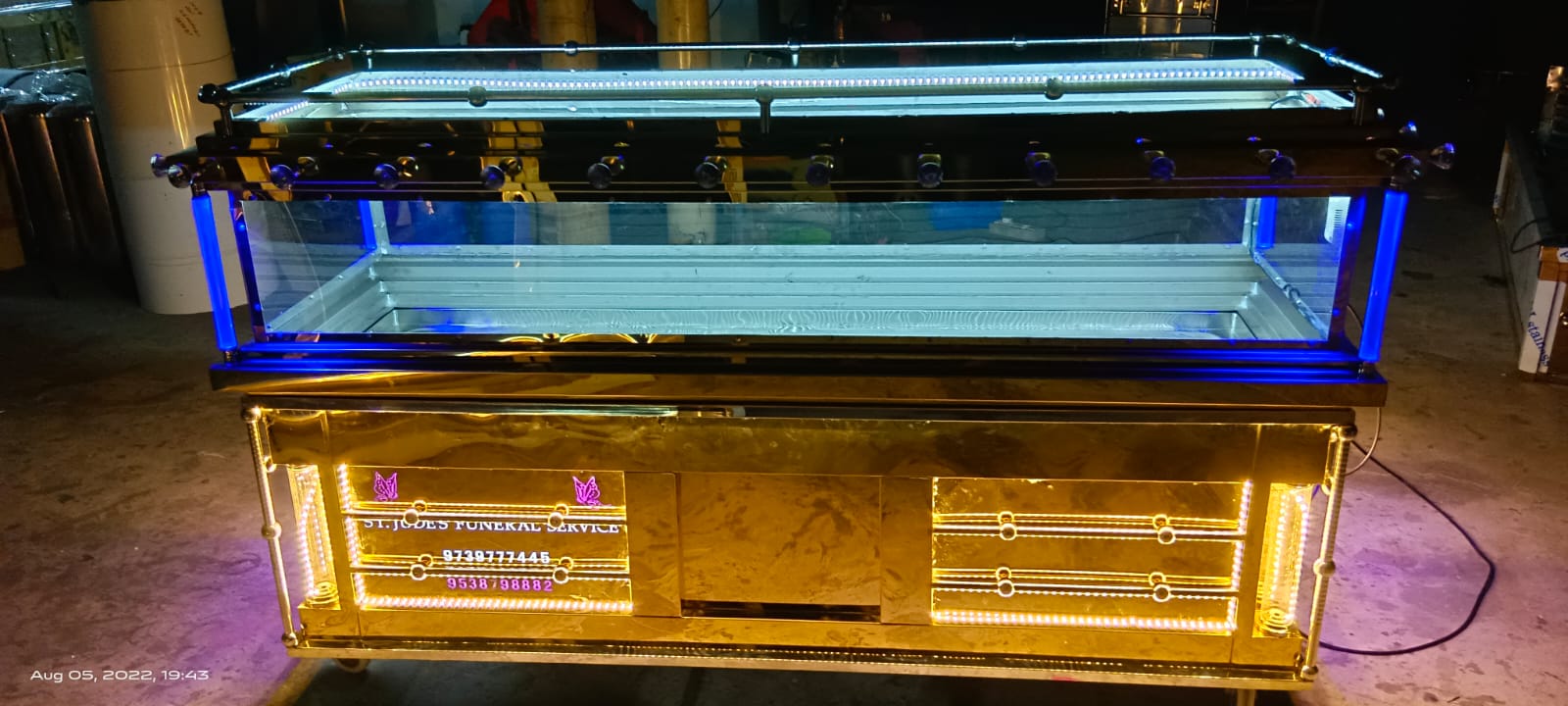 We are manufacturing the MC 008 Gold Grand VIP Laser Cutting Model in Gold Stainless Steel Single Dead body freezer also. In this model fully fabricated in Gold Stainless steel japan mirror finishing. In MC 008 Model we use Poly Carbonate sheet glass & the glass has top & side view. we fitted Emerson Copland branded Compressor & give 1 year replacement warranty for that. Copper coil & puff insulation is used for cooling purpose. R134A Gas is used for refrigerant. In this model we fitting CFL & LED Lights inside the chamber & fitting digital temperature controller with Display. In our all dead body freezer has water drain at all stages. We give 1 year warranty for all our products when manufacturing defect comes only .This warranty not applicable for Customer defect.