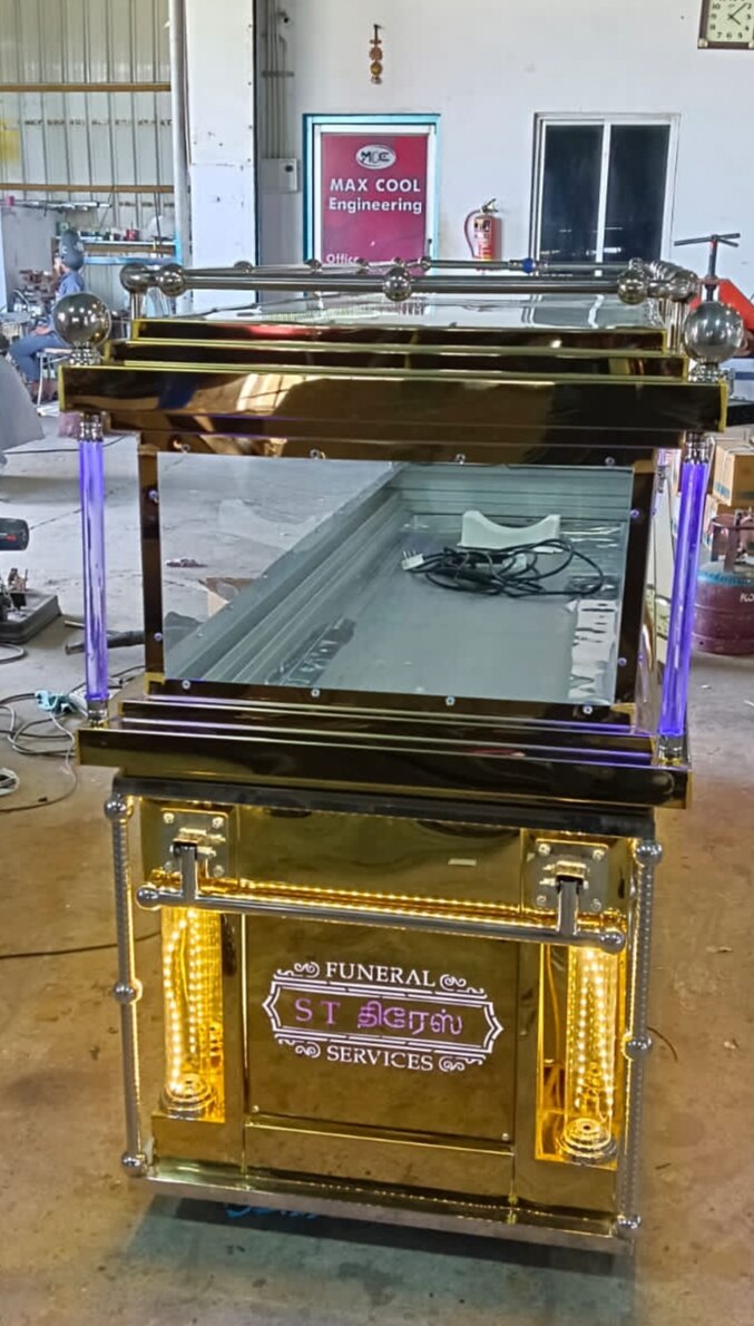 We are manufacturing the MC 008 Gold Grand VIP Laser Cutting Model in Gold Stainless Steel Single Dead body freezer also. In this model fully fabricated in Gold Stainless steel mirror finishing. In MC 008 Model we use Poly Carbonate sheet glass & the glass has top & side view. we fitted Emerson Copland branded Compressor & give 1 year replacement warranty for that. Copper coil & puff insulation is used for cooling purpose. R134A Gas is used for refrigerant. In this model we fitting LED Lights inside the chamber & fitting digital temperature controller with Display. In our all dead body freezer has water drain at all stages. We give 1 year warranty for all our products when manufacturing defect comes only .This warranty not applicable for Customer defect.