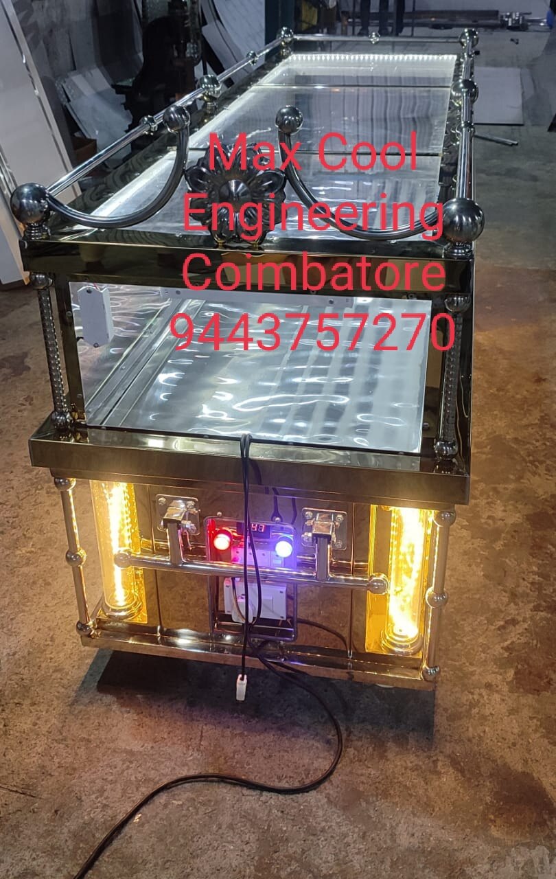 We are manufacturing the MC 008 Gold Grand VIP Model in Gold Stainless Steel Single Dead body freezer also. In this model fully fabricated in Gold Stainless steel mirror finishing. In this Box Corner side we has used Round type Acrylic Tubes for decoration purpose .In MC 008 Model we use Poly Carbonate sheet glass & the glass has top & side view. we fitted Emerson Copland branded Compressor & give 1 year replacement warranty for that. Copper coil & puff insulation is used for cooling purpose. R134A Gas is used for refrigerant. In this model we fitting LED Lights inside the chamber & fitting digital temperature controller with Display. In our all dead body freezer has water drain at all stages. We give 1 year warranty for all our products when manufacturing defect comes only .This warranty not applicable for Customer defect.