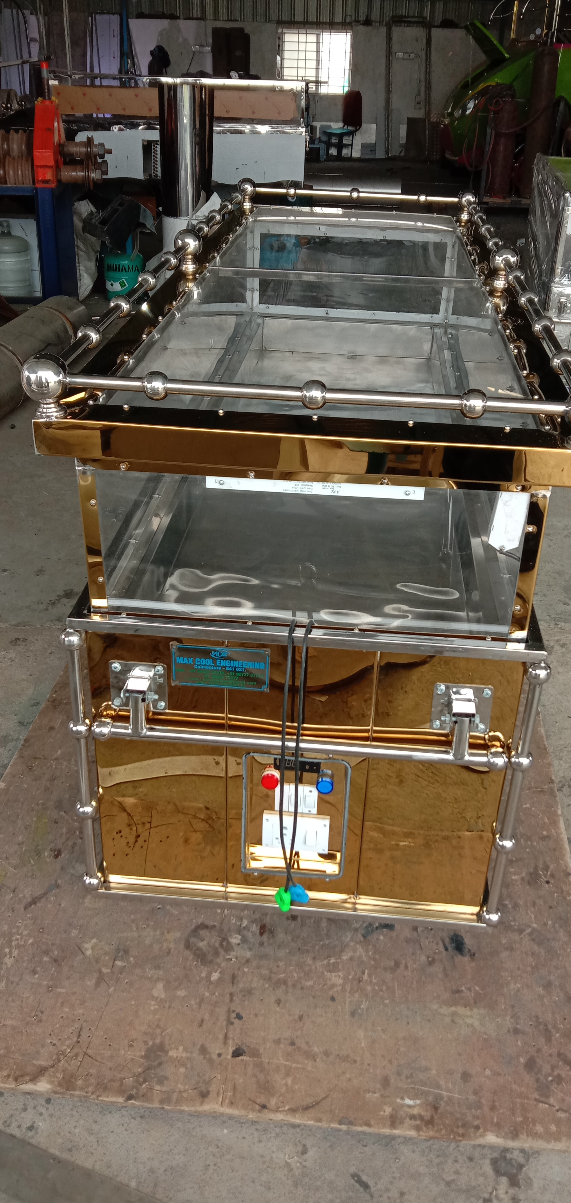 Our One Another Product Gold Heavy Square Dead Body Freezer Box.This Gold Square box having 5 Side Cooling.This Gold Square Heavy Box fully fabricated in Gold Sheet. This Gold Square box have inside Stainless Steel stature also.Gold Heavy square box inside we fit Emerson Copland(Kirosker) compressor.Compressor have 1 year warranty . This Gold Square box door opening type Top Open type. Gold Box Inner And outer Body fabricated gold Stainless steel japan mirror finishing sheet.Gold Square Cooling Type Direct Cooling (Penta Cool) .Gold Square Cooling Coil Copper. Gold Square Condenser Copper Air Cooling.Gold Square Insulation Puff.Gold Square Temperature Controller Digital with Display. Gold Square Light LED Light Mounting for Visibility Chamber.