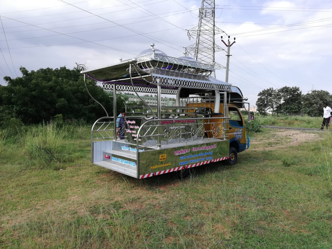 This Sorgaratham also our one of the Product . This Sorgaratham fabricated fully in Stainless steel sheets & pipes. By platform we use aluminium Checked sheets. We delivered the Sorgaratham with one kombu set in back side of the cabin , audio set, Multi Color LED Lights, Painting & Stickering.(Painting and Stickering as Customer Choice)