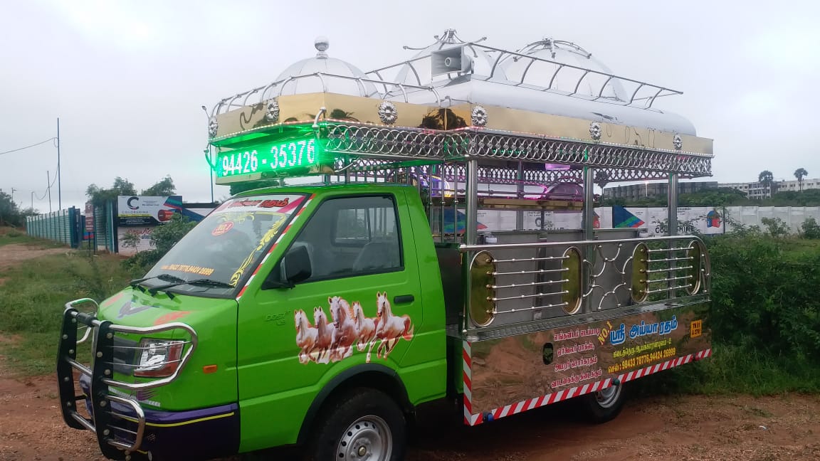This is our another one of the sorgaratham model.This model make in Ashok Leyland .This Sorgaratham fully fabricated in Gold and Stainless steel sheets and Pipes.This Sorgaratham has decorated multi color LED lights.This sorgaratham has LED board in front of the cabin. we delivered sorgaratham including audio,painting ,stickering (customer choice).