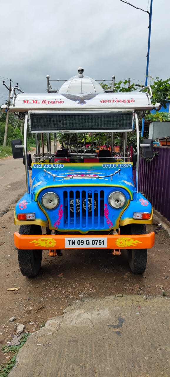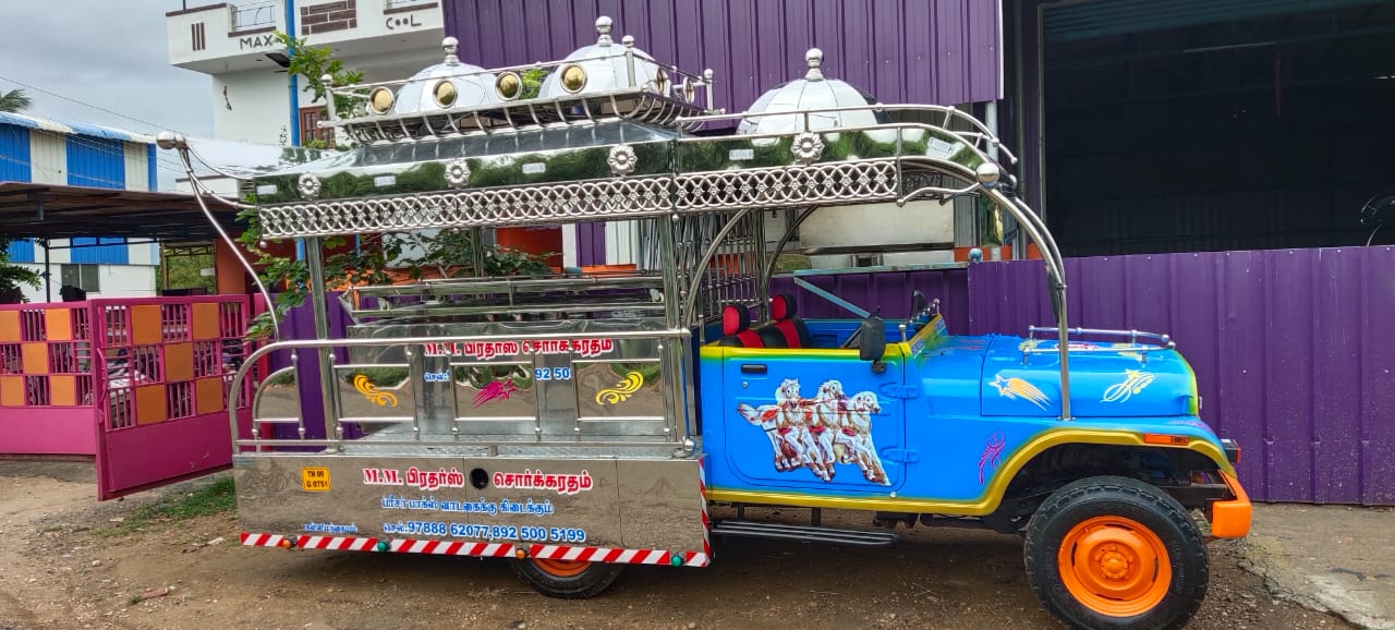 Sorgaratham in Jeep MM540 Vehicle. Sorgaratham has full and full decorated with stainless steel sheets, pipes.This Sorgaratham front face has not been changed .Cabin top portion only changed. This Sorgaratham Platform has in Aluminium qualified sheet. This Sorgaratham fully Painted with colorfully .This Sorgaratham Decorated with Design of Stickering. (Stickering and painting as per customer choice.) Sorgaratham has Manufacturing in Coimbatore. Sorgaratham has Manufacturing in Tamil Nadu.