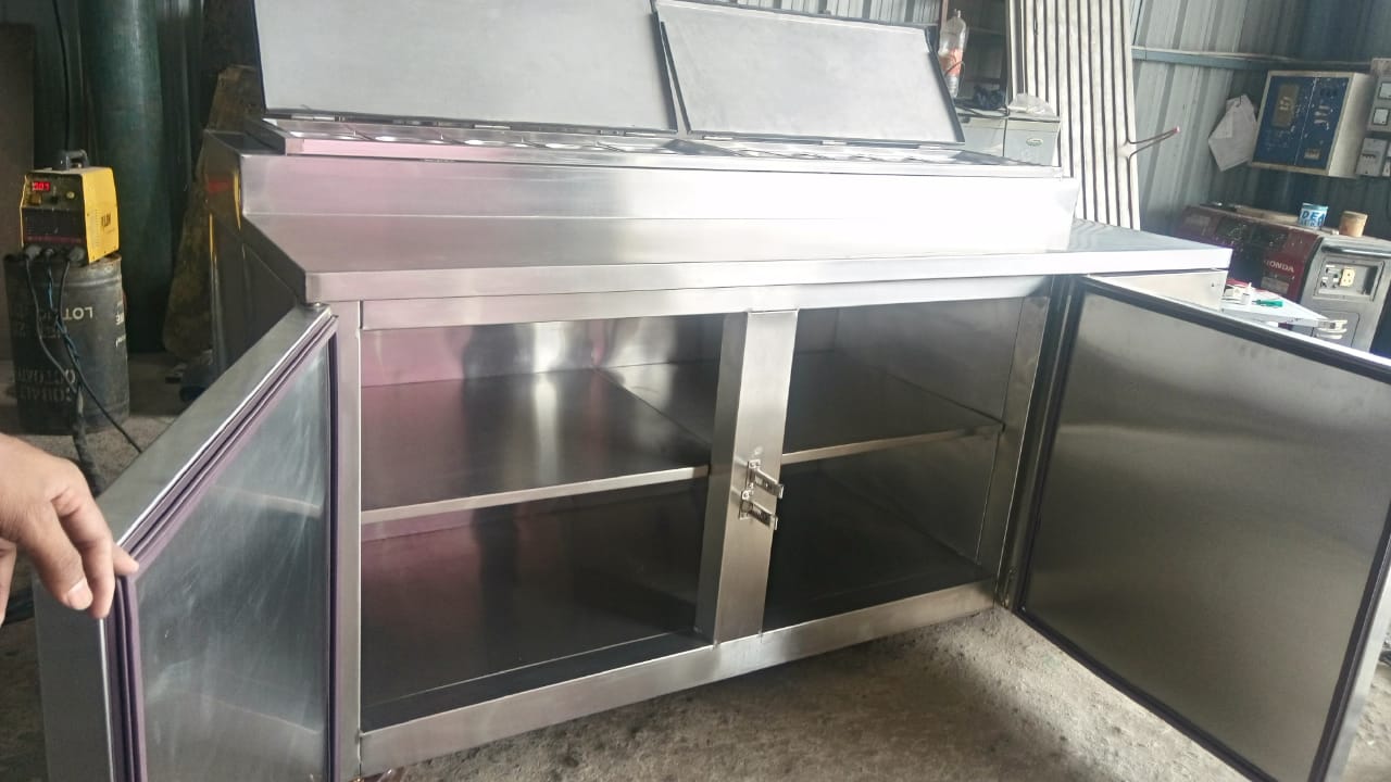 Our another one Product Table Top Freezer with Salad Containers.Table Top Freezer with Salad Containers fully fabricated with 304 food grade sheet.Table Top Freezer with Salad Containers door type 2 Door ,3 Door, as per customer required.Table Top Freezer with Salad Containers 2 Door freezer like have 4 shelf in in side.Table Top Freezer with Salad Containers we fit Emerson Copland (kirlosker)Brand Compressor in side the product. Table Top Freezer with Salad Containers are removable type and we give separate lid in with each one containers.Table Top Freezer with Salad Containers doors are we fit magnetic with heavy duty handle. Table Top Freezer with Salad Containers doors are easy to handle.Table Top Freezer with Salad Containers we using copper coil in cooling purpose. Top Freezer with Salad Containers Cooling Type Direct Cooling.Top Freezer with Salad Containers Condenser Copper air cooling. Top Freezer with Salad Containers Insulation Puff 120 mm.Top Freezer with Salad Containers Temperature Controller Digital Controller with Display .Top Freezer with Salad Containers Temperature Range -10°C to -20℃Top Freezer with Salad Containers Refrigerant R 134 A.Top Freezer with Salad Containers Working Voltage 230v±10%.Top Freezer with Salad Containers Operating Pilot lamp with main switch mounting for front panel .