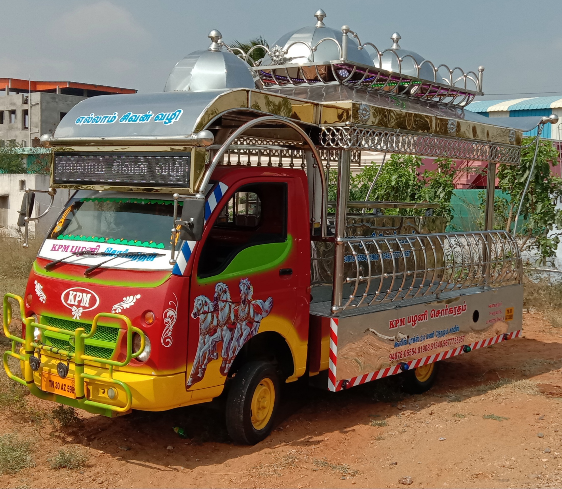 Model Name : Sorgaratham Type of Vehicle: Tata Ace . Total Body fabricated : Stainless steel Sheet and Pipes. * Fit LED Name Board front of the cabin. * This Sorgaratham decorated with Multi Color Lights & Kombu Sets. * Platform has Aluminium Checked Sheets. * This Sorgaratham has Audio set. *This Sorgaratham seats Covers also new. * This Painting Color and Stickering Customer Choice. * This Sorgaratham has a rotating Stature. Sorgaratham Manufacturing in Coimbatore. Sorgaratham Manufacturing in Madurai. Sorgaratham Manufacturing in Trichy. Sorgaratham Manufacturing in Salem. Sorgaratham Manufacturing in Tamil Nadu.