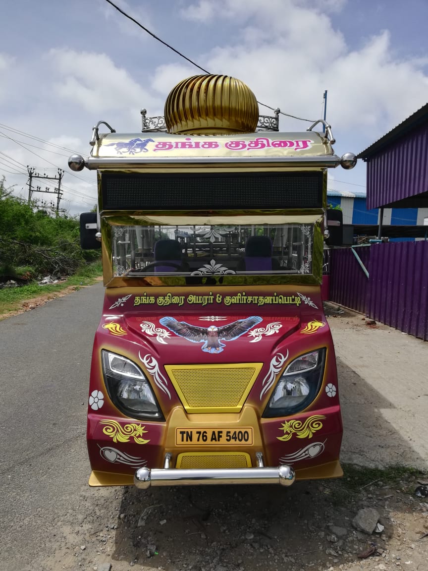 This Sorgaratham is our another one of the Model . This Sorgaratham fabricated fully in Gold Stainless steel sheets & pipes .This Sorgaratham model top design Umbrella Model. Platform we use aluminium Checked sheets. This Sorgaratham Cabin back side we fit one Kombu set . We delivered the Sorgaratham with audio set, Multi Color LED Lights, Painting & Stickering.(As per choice)