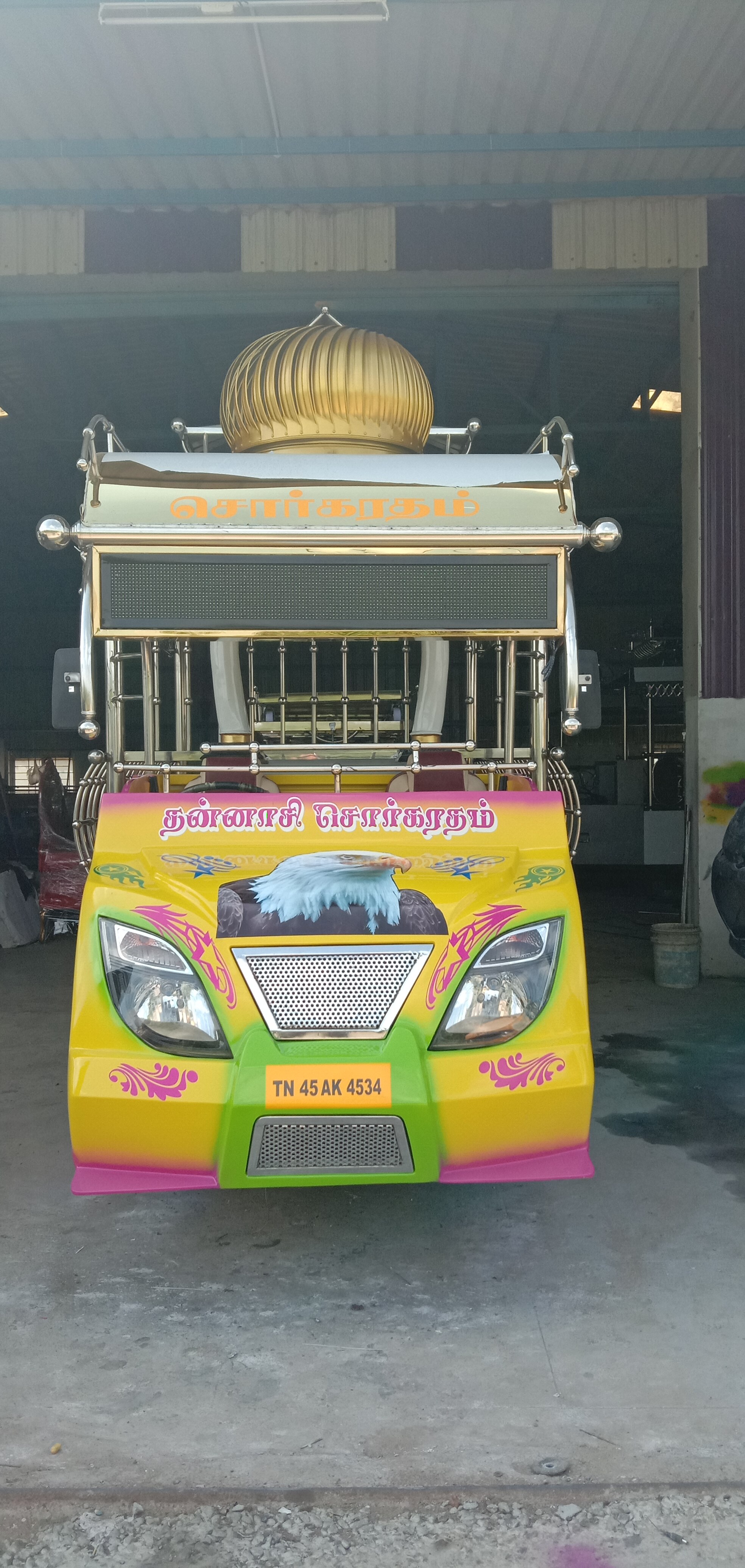 This Sorgaratham is our another one of the Model . This Sorgaratham fabricated fully in Gold and Stainless steel sheets & pipes .This Sorgaratham model top design Temple Step Model. Platform we use aluminium Checked sheets. This Sorgaratham Cabin back side we fit one Kombu set . We delivered the Sorgaratham with audio set, Multi Color LED Lights, Painting & Stickering.(As per choice)