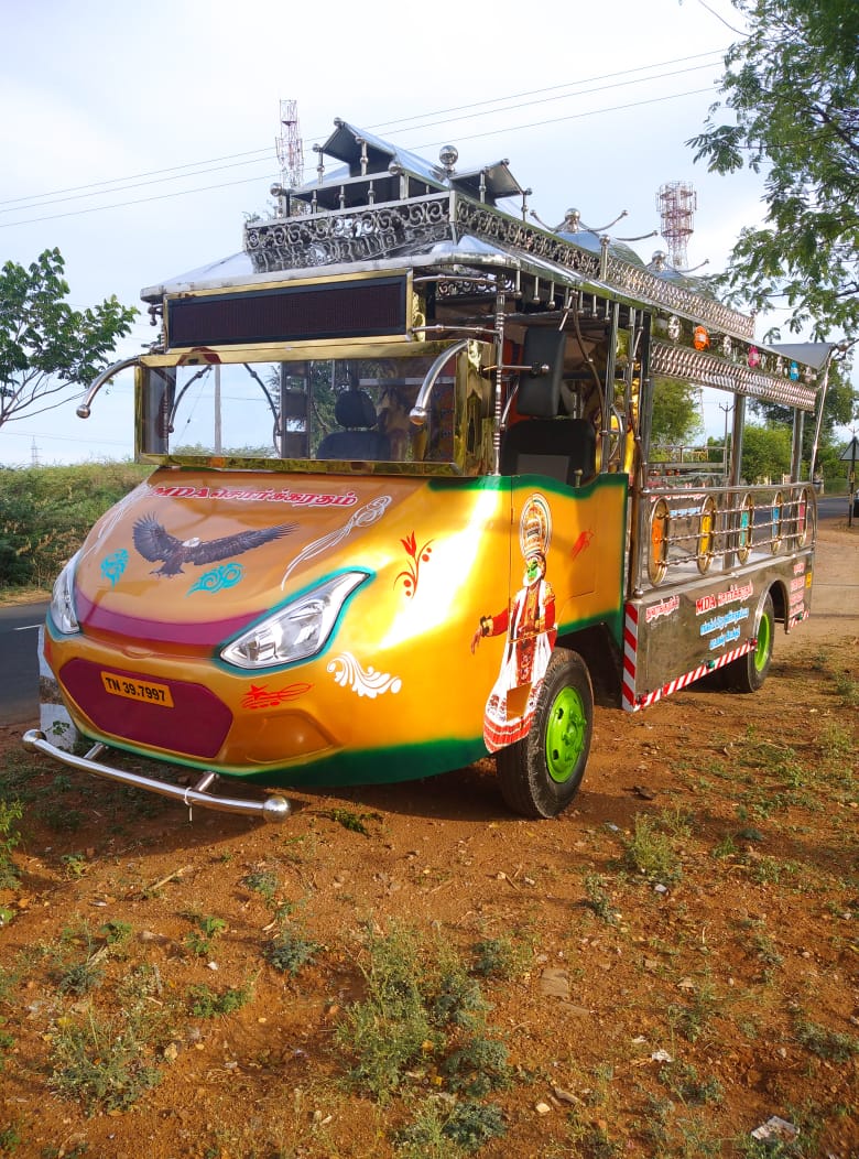 This Sorgaratham is our another one of the Model . This Sorgaratham fabricated fully in Stainless steel sheets & pipes And Gold Sheet Mixing.This Sorgaratham model top design Umbrella Model. Platform we use aluminium Checked sheets. This Sorgaratham Cabin back side we fit one Kombu set and Singam Statue . We delivered the Sorgaratham with audio set, Multi Color LED Lights, Painting & Stickering.(As per choice)
