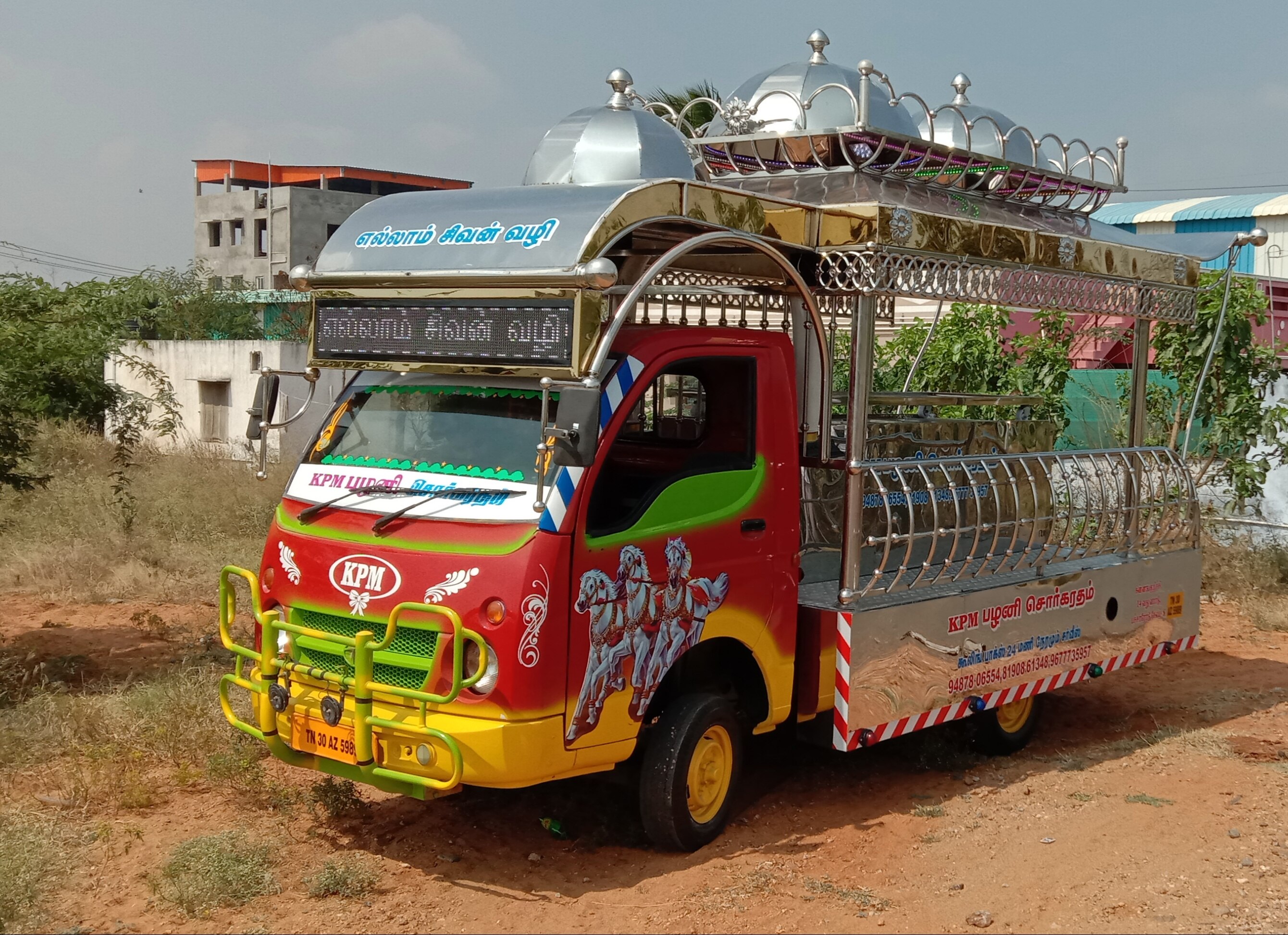 This Sorgaratham is our another one of the Model . This Sorgaratham fabricated fully in Stainless steel sheets & pipes And Stainless Sheet Mixing.This Sorgaratham model top design Temple Model. Platform we use aluminium Checked sheets. We delivered the Sorgaratham with audio set, Multi Color LED Lights, Painting & Stickering.(As per choice)