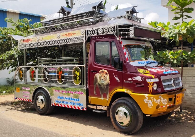 This Sorgaratham is our another one of the Model . This Sorgaratham fabricated fully in Stainless steel sheets & pipes And Gold Stainless Sheet Mixing.This Sorgaratham model top design Step Model. Platform we use aluminium Checked sheets. We delivered the Sorgaratham with audio set, Multi Color LED Lights, Painting & Stickering.(As per choice)