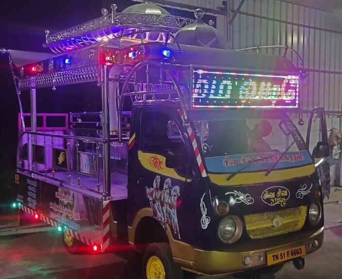 This Sorgaratham is our another one of the Model . This Sorgaratham fabricated fully in Stainless steel sheets & pipes And Gold Stainless Sheet Mixing.This Sorgaratham model top design Umbrella Model. Platform we use aluminium Checked sheets. We delivered the Sorgaratham with audio set, Multi Color LED Lights, Painting & Stickering.(As per choice)