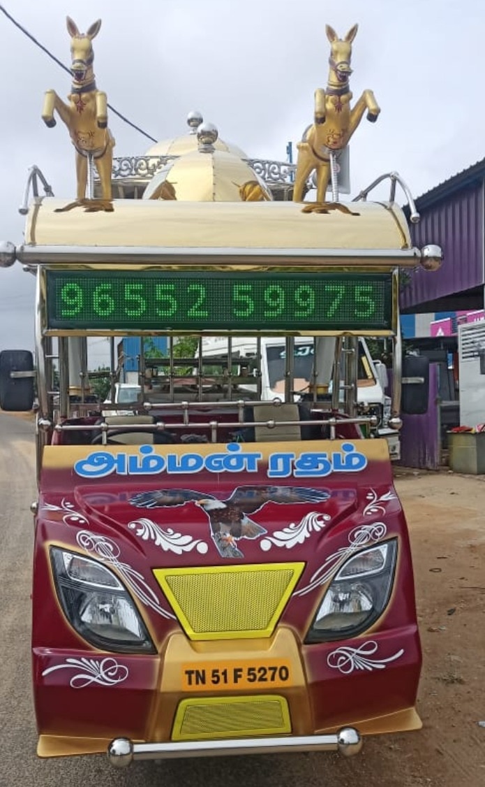 This Sorgaratham is our another one of the Model . This Sorgaratham fabricated fully in Gold Stainless steel sheets & pipes And Stainless Sheet Mixing.This Sorgaratham model top design Umbrella Model. Platform we use aluminium Checked sheets. This Model has Horse Statue in top.We delivered the Sorgaratham with audio set, Multi Color LED Lights, Painting & Stickering.(As per choice)