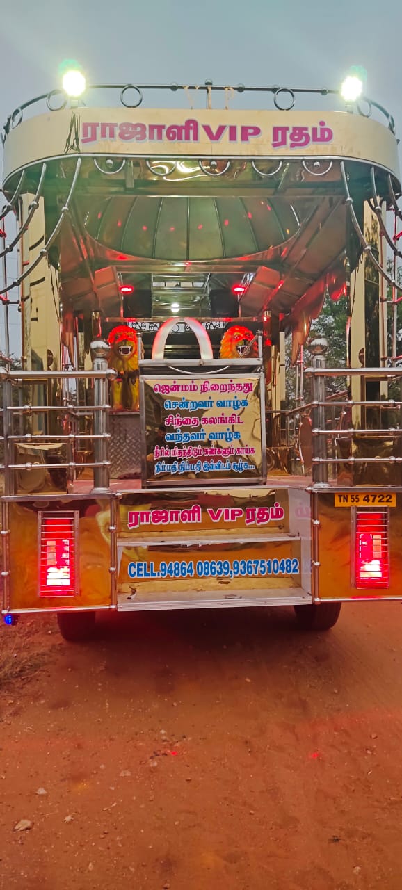 This Sorgaratham is our another one of the Model . This Sorgaratham fabricated fully in Stainless steel sheets & pipes And Stainless Sheet Mixing.This Sorgaratham model top design Umbrella Model. Platform we use aluminium Checked sheets. We delivered the Sorgaratham with audio set, Multi Color LED Lights, Painting & Stickering.(As per choice)