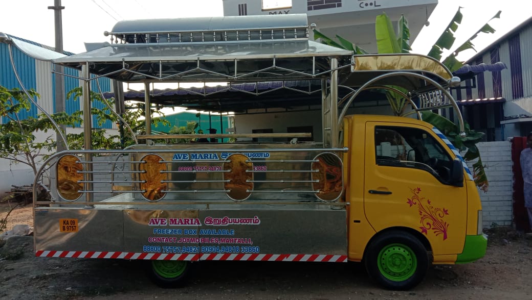 This Sorgaratham is our another one of the Model . This Sorgaratham fabricated fully in Stainless steel sheets & pipes And Stainless Sheet Mixing.This Sorgaratham model top design Customer Choice. Platform we use aluminium Checked sheets. We delivered the Sorgaratham with audio set, Multi Color LED Lights, Painting & Stickering.(As per choice)