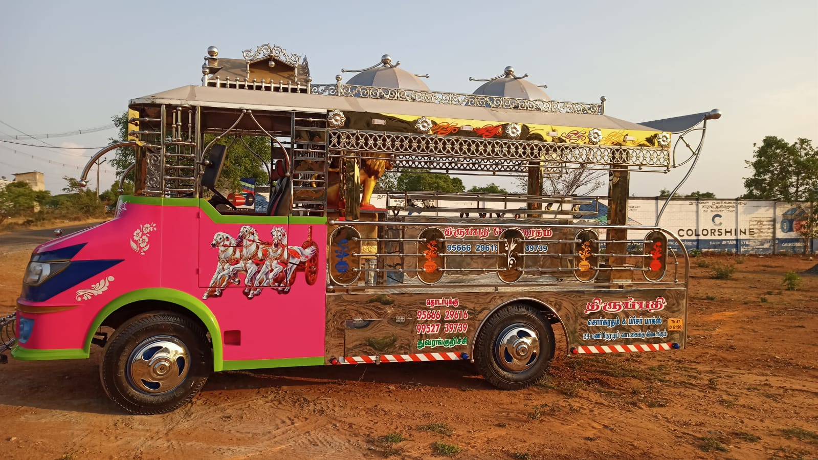This Sorgaratham is our another one of the Model . This Sorgaratham fabricated fully in Gold & Stainless steel sheets & pipes And Stainless Sheet Mixing.This Sorgaratham model top design Umbrella Model. Platform we use aluminium Checked sheets. We delivered the Sorgaratham with audio set, Multi Color LED Lights, Painting & Stickering.(As per choice)