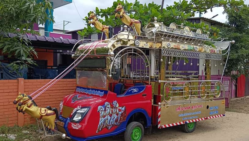 This Sorgaratham is our another one of the Model . This Sorgaratham fabricated fully in Gold Stainless steel sheets & pipes And Stainless Sheet Mixing.This Sorgaratham model top design Umbrella Model. Platform we use aluminium Checked sheets. This Sorgaratham has Horse Statue in front Side. We delivered the Sorgaratham with audio set, Multi Color LED Lights, Painting & Stickering.(As per choice)