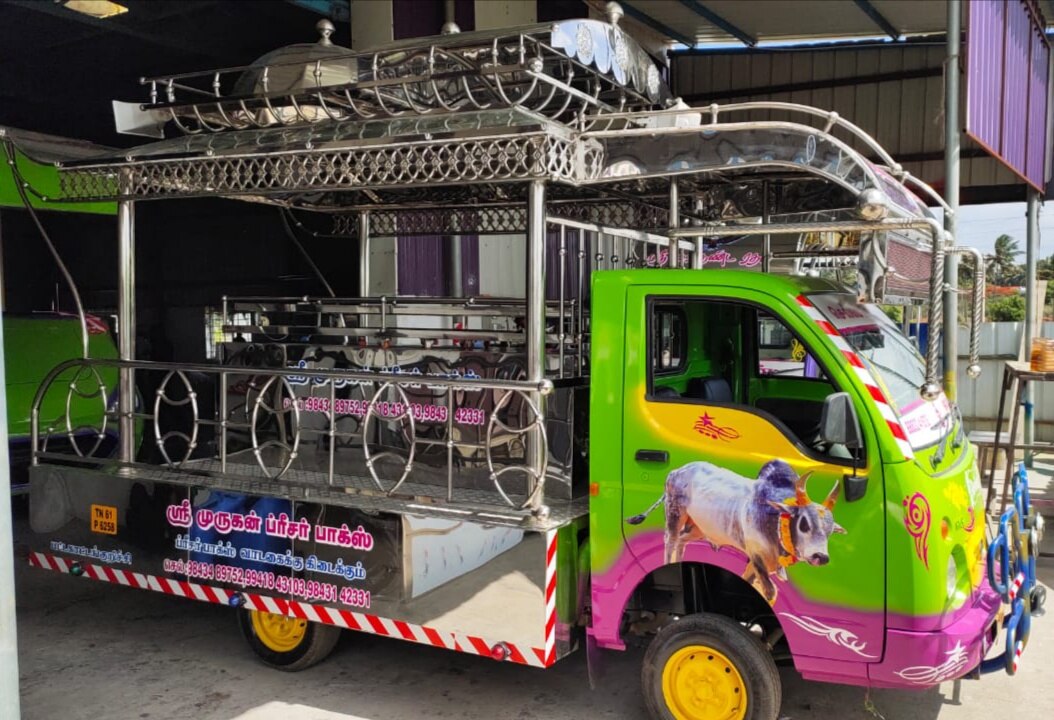 This Sorgaratham is our another one of the Model . This Sorgaratham fabricated fully in Stainless steel sheets & pipes And Stainless Sheet Mixing.This Sorgaratham model top design Temple Model. Platform we use aluminium Checked sheets. We delivered the Sorgaratham with audio set, Multi Color LED Lights, Painting & Stickering.(As per choice)