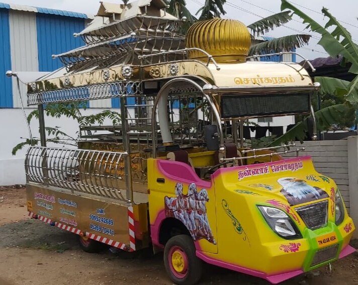 This Sorgaratham is our another one of the Model . This Sorgaratham fabricated fully in Gold Stainless steel sheets & pipes And Stainless Sheet Mixing.This Sorgaratham model top design Temple Model. Platform we use aluminium Checked sheets. We delivered the Sorgaratham with audio set, Multi Color LED Lights, Painting & Stickering.(As per choice)