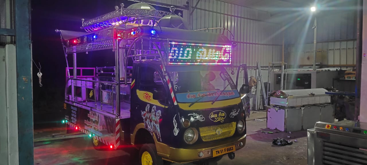 This Sorgaratham is our another one of the Model . This Sorgaratham fabricated fully in Stainless steel & Gold Stainless steel sheets & pipes And Stainless Sheet Mixing.This Sorgaratham model top design Temple Model. Platform we use aluminium Checked sheets. We delivered the Sorgaratham with audio set, Multi Color LED Lights, Painting & Stickering.(As per choice)