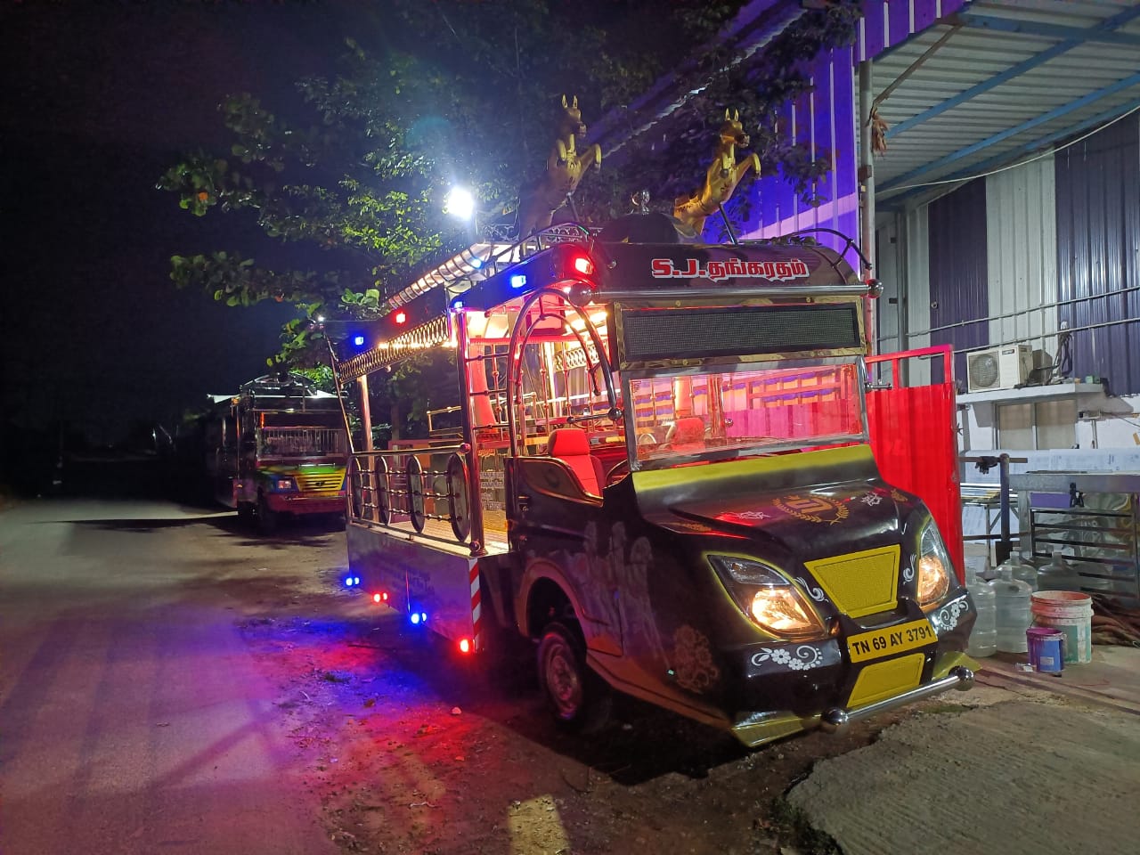This Sorgaratham is our another one of the Model . This Sorgaratham fabricated fully in Stainless Steel Sheets & Stainless Steel pipes Mixing.This Sorgaratham model top Temple Step design Model. Platform we use aluminium Checked sheets. We delivered the Sorgaratham with audio set, Multi Color LED Lights, Painting & Stickering.(As per choice)