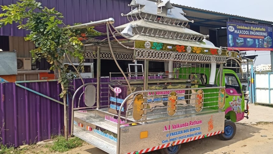 This Sorgaratham is our another one of the Model . This Sorgaratham fabricated fully in Stainless steel & Stainless steel sheets & pipes And Stainless Sheet Mixing.This Sorgaratham model top design Temple Model. Platform we use aluminium Checked sheets. We delivered the Sorgaratham with audio set, Multi Color LED Lights, Painting & Stickering.(As per choice)