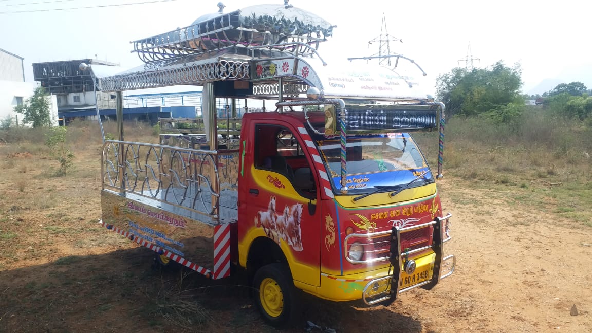 This Sorgaratham is our another one of the Model . This Sorgaratham fabricated fully in Stainless steel sheets & pipes And Stainless Sheet Mixing.This Sorgaratham model top design Single Umbrella Model. Platform we use aluminium Checked sheets. We delivered the Sorgaratham with audio set, Multi Color LED Lights, Painting & Stickering.(As per choice)