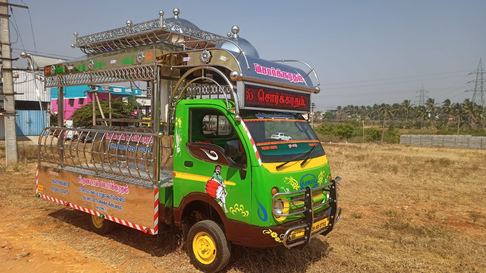 This Sorgaratham is our another one of the Model . This Sorgaratham fabricated fully in Stainless steel & Gold sheets & pipes And Stainless Sheet Mixing.This Sorgaratham model top design Umbrella Model. Platform we use aluminium Checked sheets. We delivered the Sorgaratham with audio set, Multi Color LED Lights, Painting & Stickering.(As per choice)