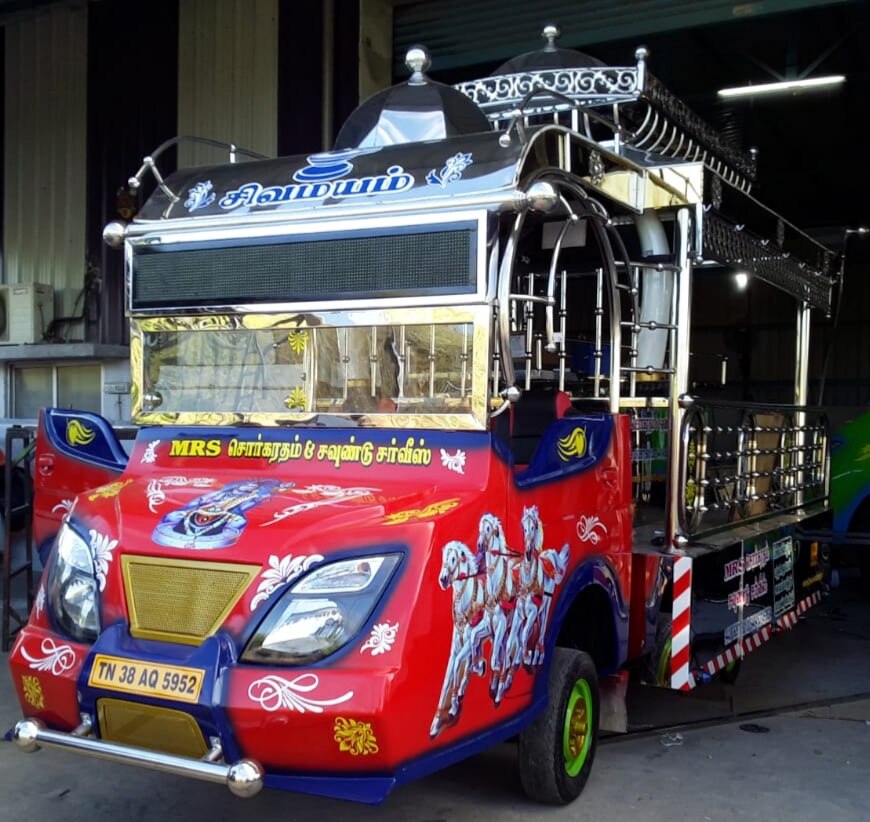 This Sorgaratham is our another one of the Model . This Sorgaratham fabricated fully in Stainless steel & Stainless Steel pipes Mixing.This Sorgaratham model top design Umbrella Model. Platform we use aluminium Checked sheets. We delivered the Sorgaratham with audio set, Multi Color LED Lights, Painting & Stickering.(As per choice)