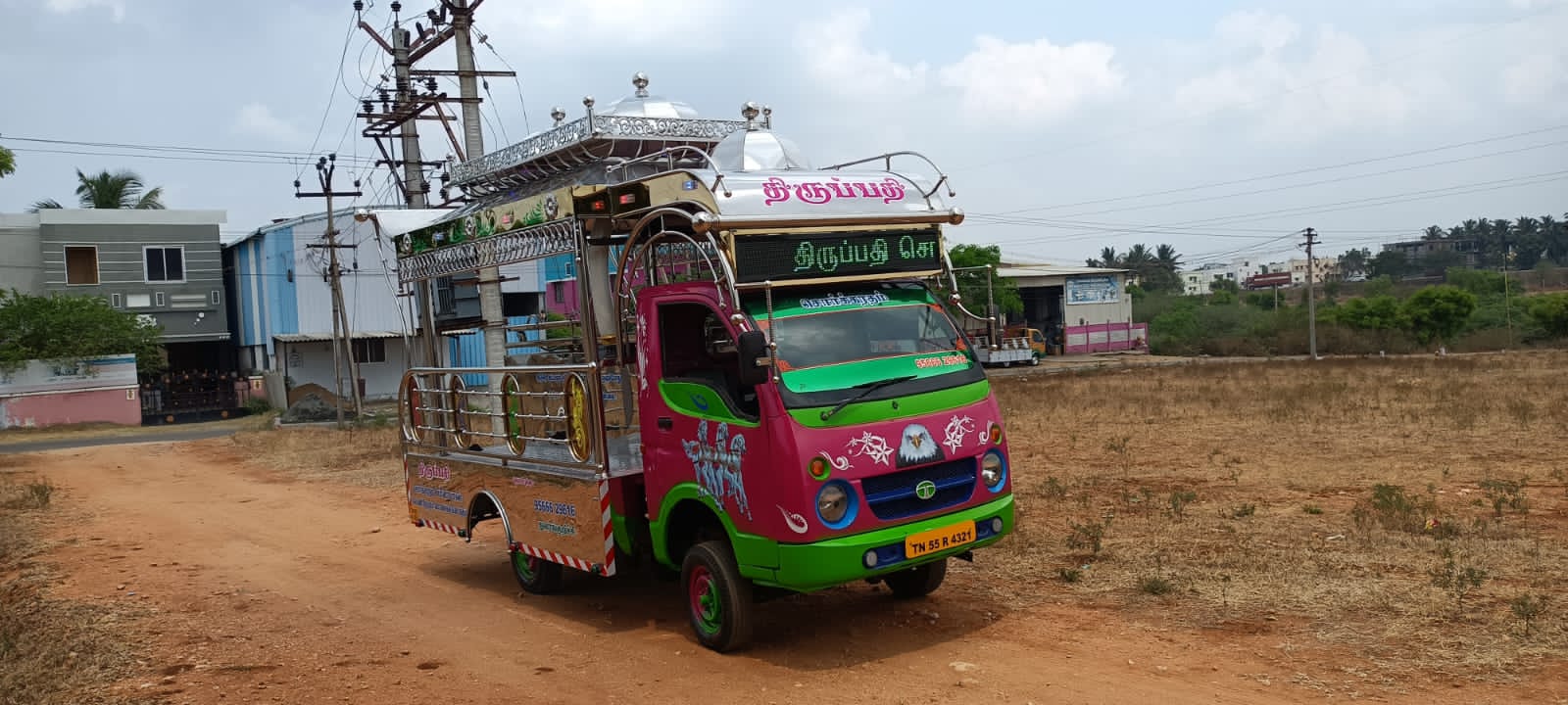 This Sorgaratham is our another one of the Model . This Sorgaratham fabricated fully in Stainless steel & Stainless Steel pipes Mixing.This Sorgaratham model top design Umbrella Model. Platform we use aluminium Checked sheets. We delivered the Sorgaratham with audio set, Multi Color LED Lights, Painting & Stickering.(As per choice)