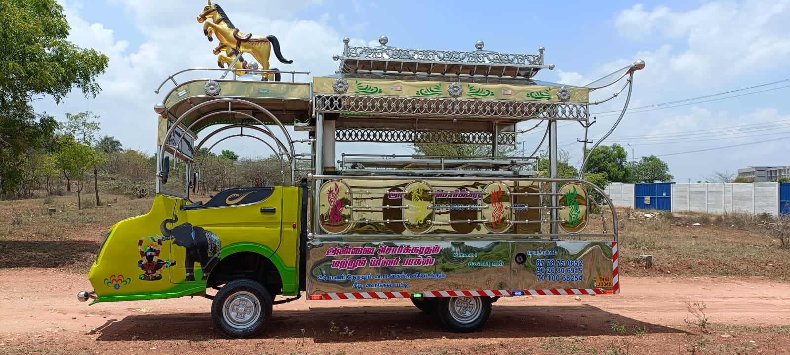 This Sorgaratham is our another one of the Model . This Sorgaratham fabricated fully in Stainless steel & Stainless Steel pipes Mixing.This Sorgaratham model top design Umbrella Model. Platform we use aluminium Checked sheets. We delivered the Sorgaratham with audio set, Multi Color LED Lights, Painting & Stickering.(As per choice)